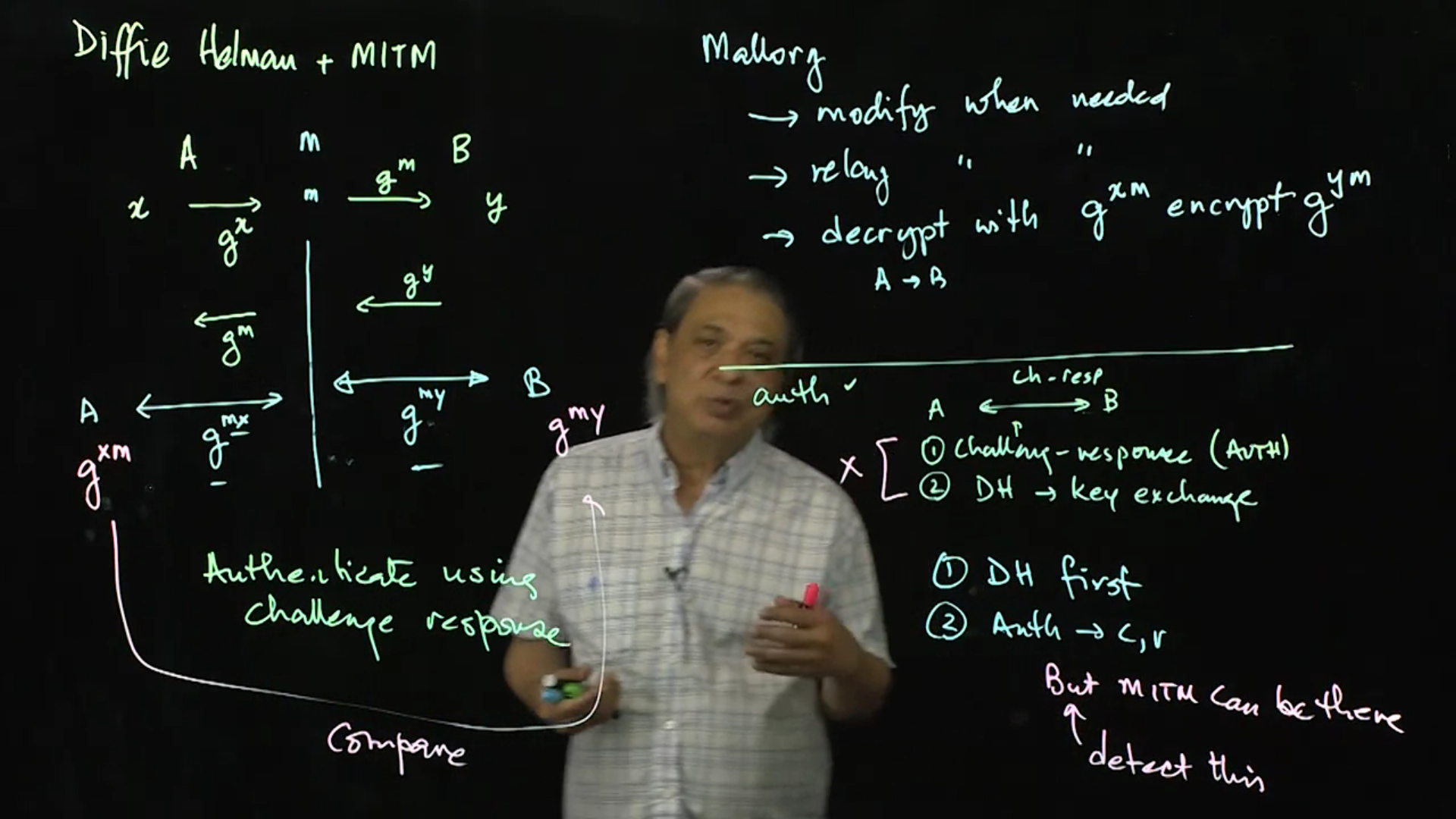 MITM attacks and Diffie Hellman: This lecture revisits Diffie Helman and MITM attacks because Diffie Helman has properties that allow for both perfect forward security and plausible deniability. However, MITM is impossible to solve. This lecture shows why, and how can we find solutions to the problem.