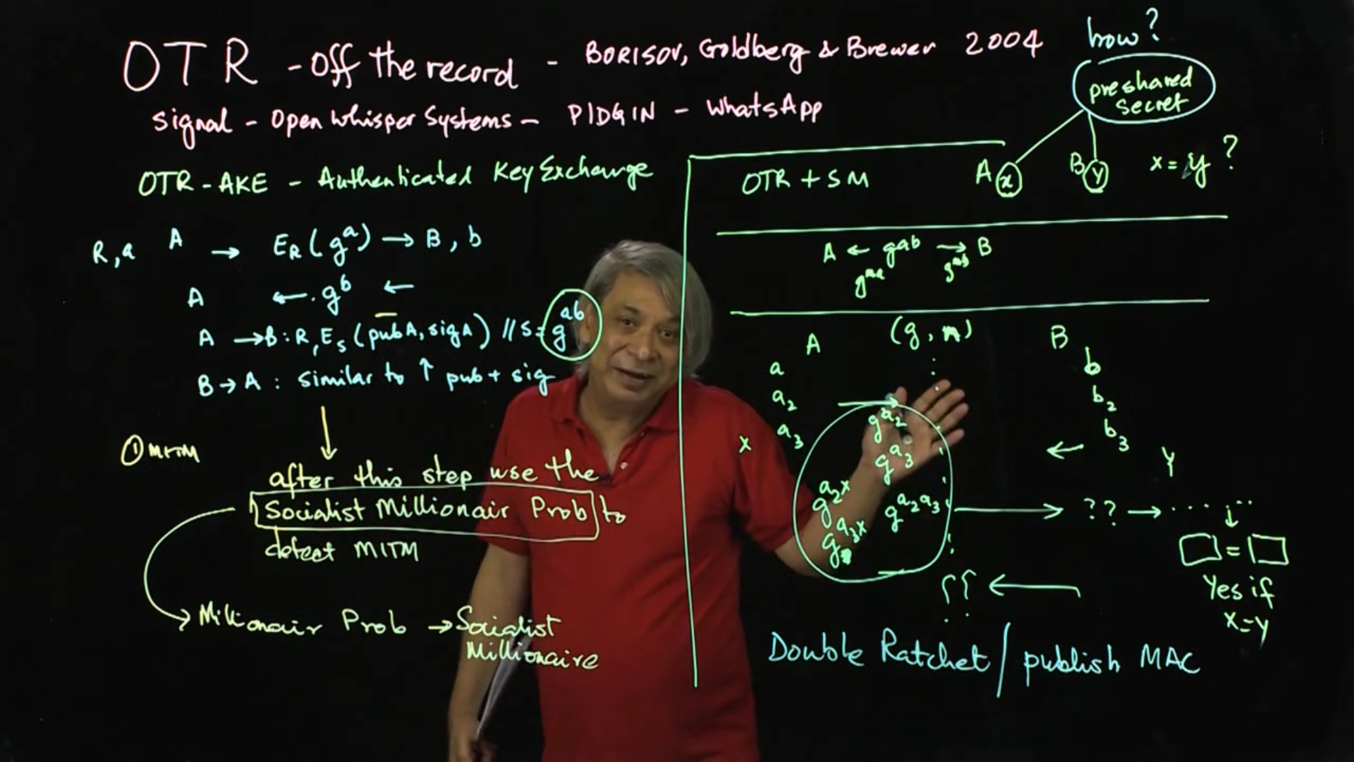 The “Off the Record” Protocol: Off the Record (OTR) is an instant messaging protocol that is built into several off-the-shelf messengers, notably signal and pidgin. This lecture presents an overview of the complex inner workings of this protocol.