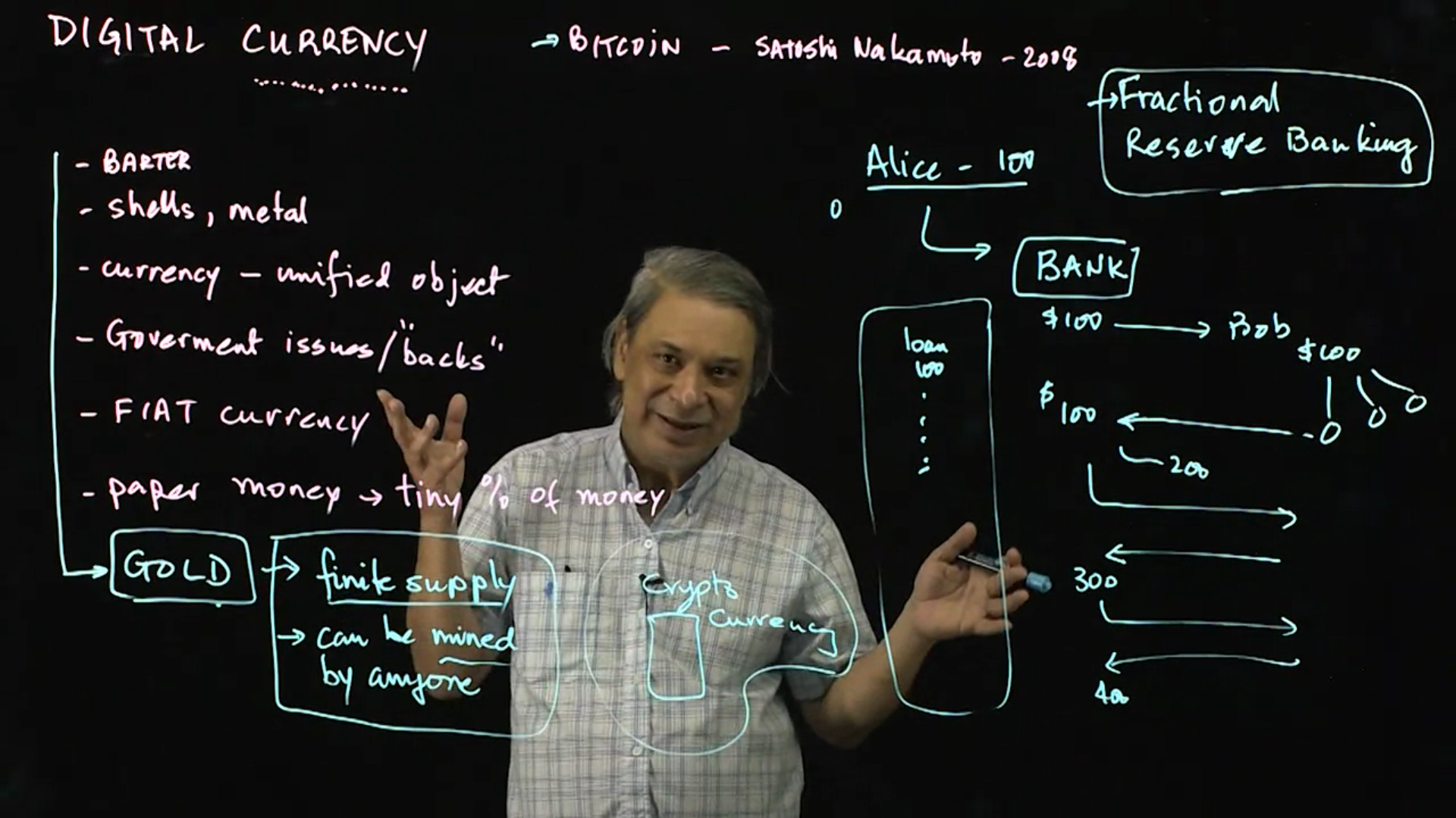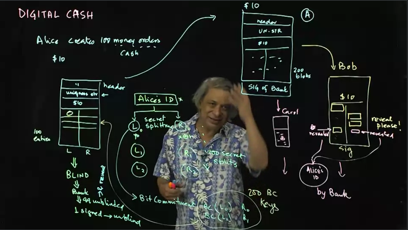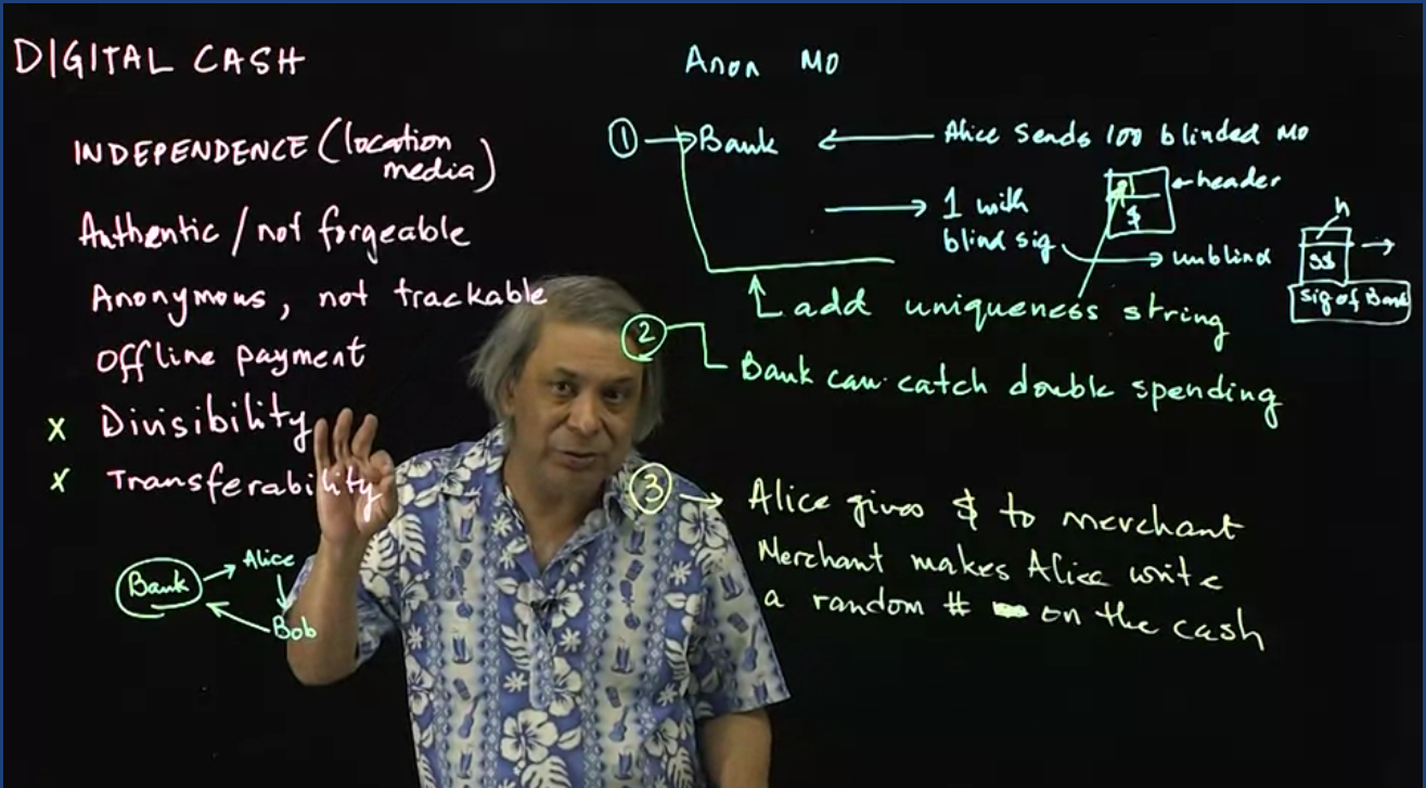 Digital cash, like paper money, is anonymous and can be used to transfer money between Alice and Bob without an internet connection. This intricate protocol is addressed in a two-part lecture.