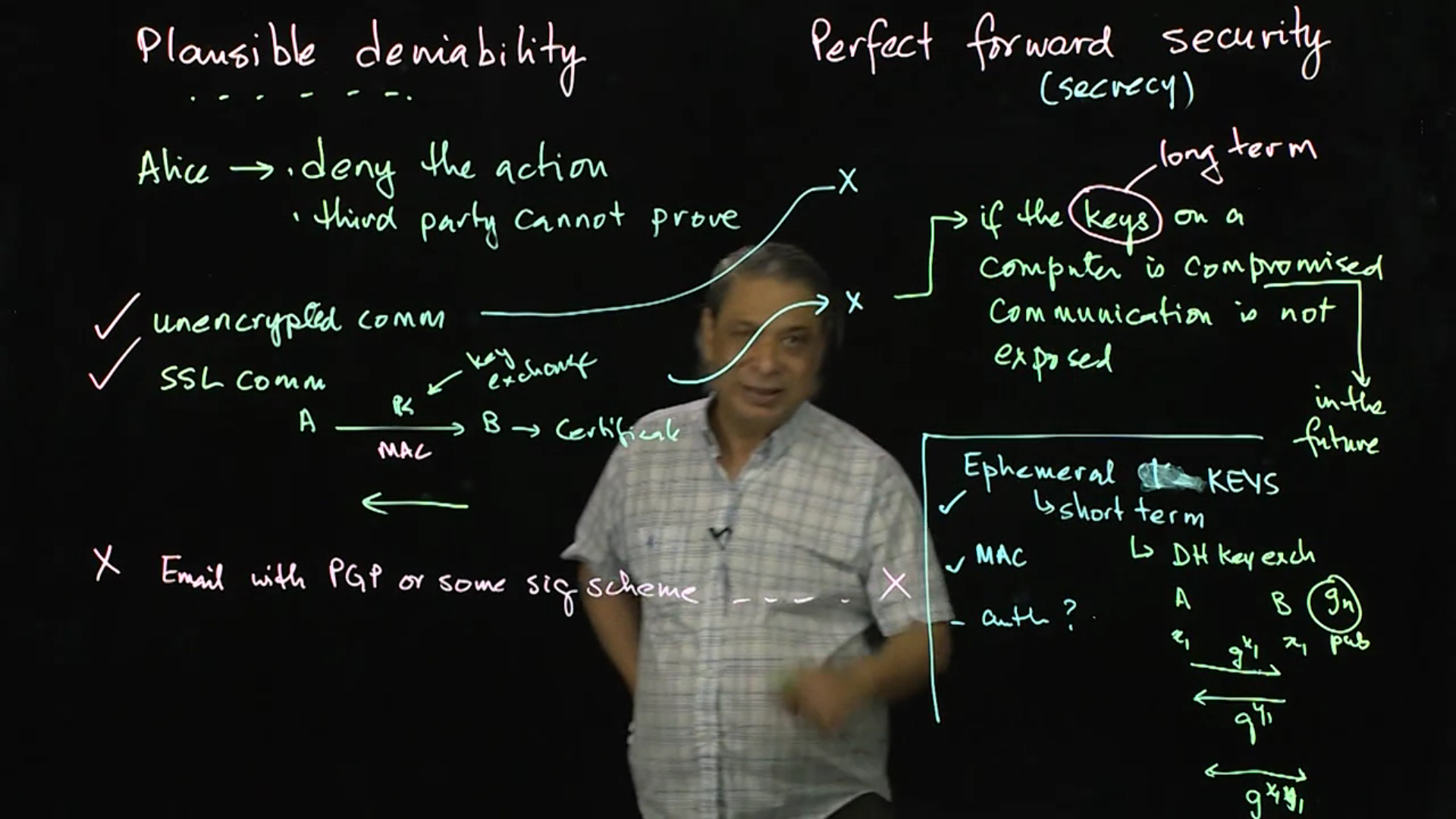 MITM attacks and Diffie Hellman: This lecture revisits Diffie Helman and MITM attacks because Diffie Helman has properties that allow for both perfect forward security and plausible deniability. However, MITM is impossible to solve. This lecture shows why, and how can we find solutions to the problem.