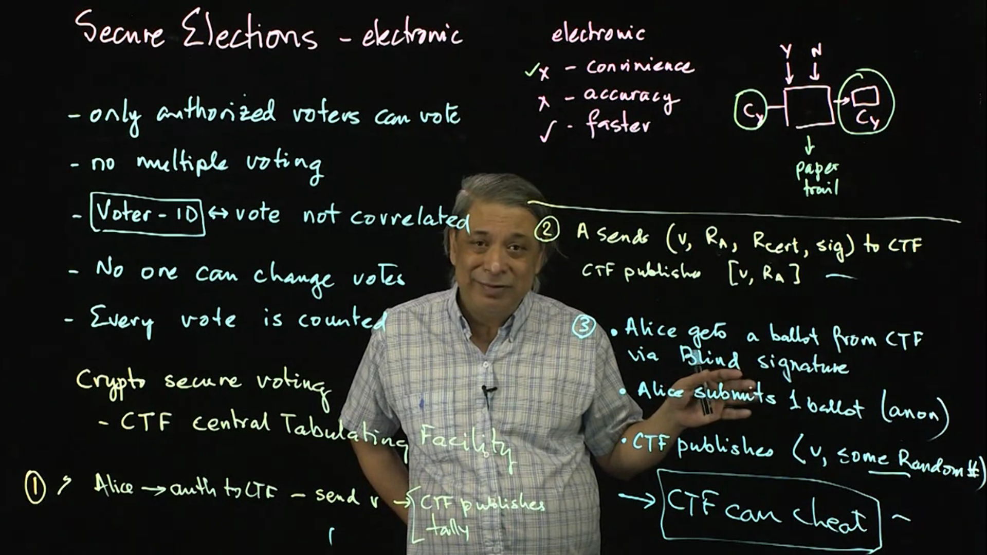 Electronic and digital voting methods are common in elections, though seriously insecure. It is nearly impossible to ensure secure voting protocols. The protocol is covered in this two-part lecture.